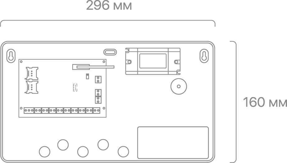 Датчик вскрытия корпуса Пластиковый корпус (опционально) Габаритные размеры без корпуса: 121×81×30 мм в корпусе «Контакт» под АКБ 1.2Ач: 296×160×90 мм в корпусе «Контакт» под АКБ 7Ач: 296×250×90 м |